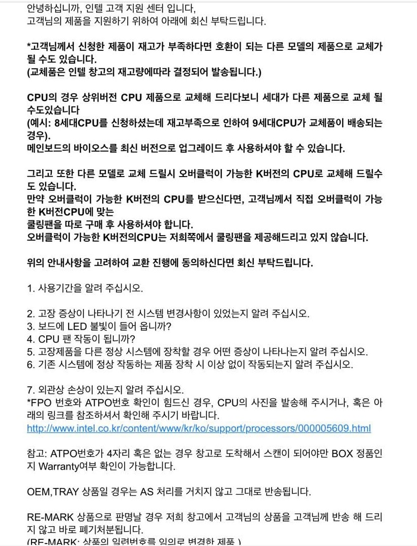 아무튼 정품박스로 구입한 CPU의 경우엔 쉽고 간단하게 AS가 진행됩니다.