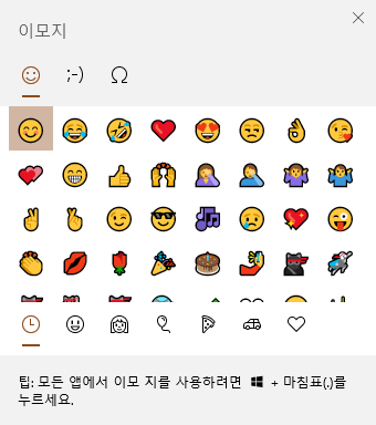 두 번째 방법은 [윈도우] + .[마침표] 단축키를 눌러서 이모티콘 입력기를 열고 아무 이모티콘이나 하나 입력하고나면 그 다음 부터는 문제없이 한글 입력이 잘 됩니다