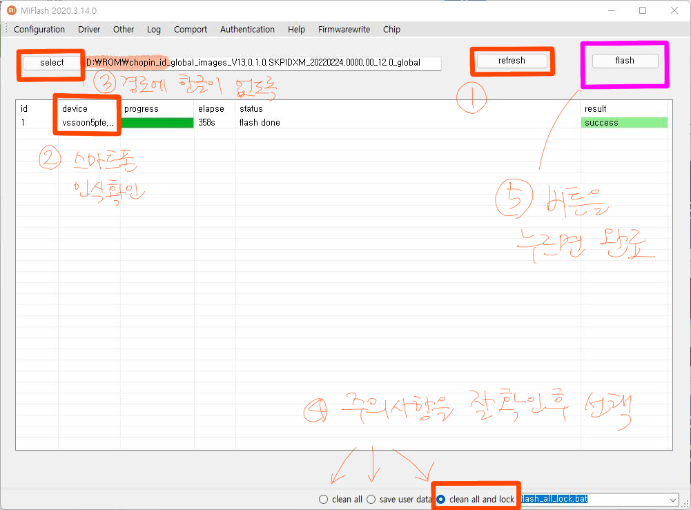 4-6. 아래쪽에 clean all and lock이 선택되어있는지 확인한 다음에 refresh 버튼 옆의 flash 버튼을 누르면 끝 (이번 롬업의 경우엔 대략 358초가 걸렸다는 걸 확인할 수 있습니다)