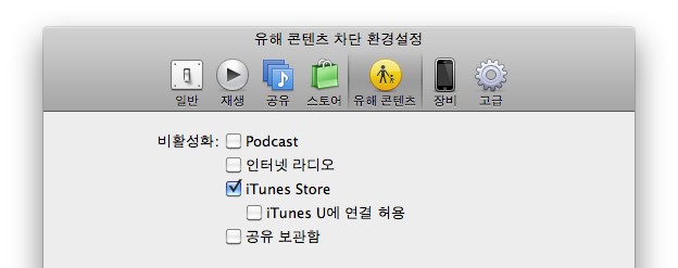 다음과 같이 설정에 들어가서 유해 콘텐츠 항목에서 아이튠스 스토어를 비활성화 해주면 된다