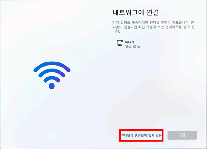 인터넷 연결을 요구하는 화면에서 인터넷에 연결되어 있지 않음 이라는 버튼이 추가되었습니다