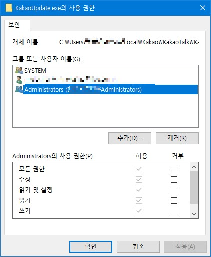 아래와 같이 SYSTEM을 제외한 모든 사용자 그룹의 권한에 거부를 선택해줍니다