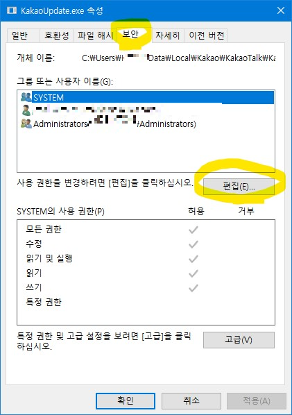 아래와 같이 SYSTEM을 제외한 모든 사용자 그룹의 권한에 거부를 선택해줍니다