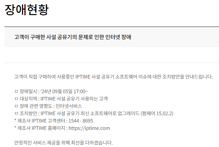 통신사 공유기는 자체 업데이트를 통해 해결할 것인데 아이피타임 공유기는 수동 펌웨어 업데이트를 통해 문제를 해결할 수 있음